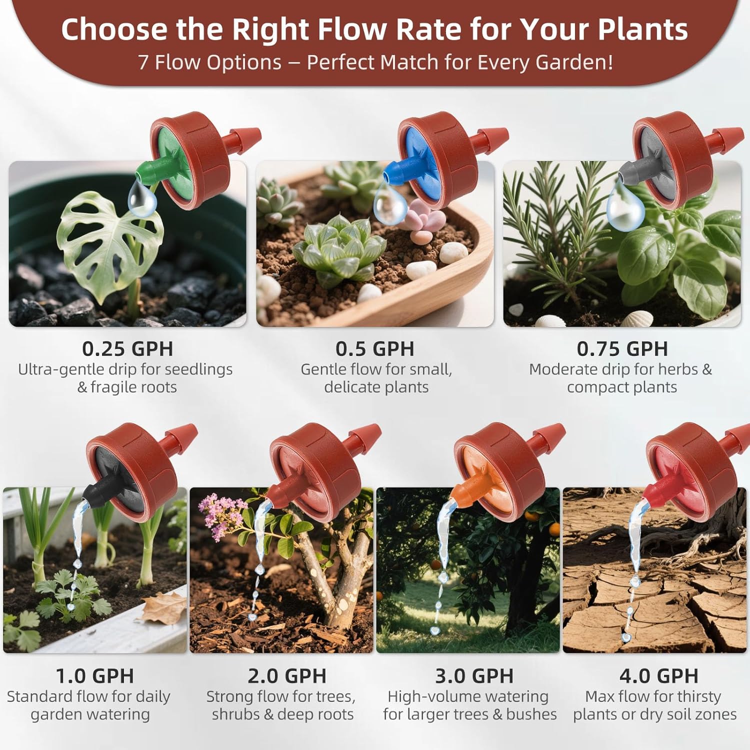 - Custom Flow Rates for Every Plant Type: Available in 0.25 GPH, 0.5 GPH, 0.75 GPH, 1 GPH, and 2 GPH options. Choose low flow for delicate flowers, medium for vegetables, and higher flow for trees or shrubs. Optimize water delivery to each plant’s unique needs. !!! CHOOSE pressure-compensating drip irrigation emitters FROM 【Spalolen】!!!