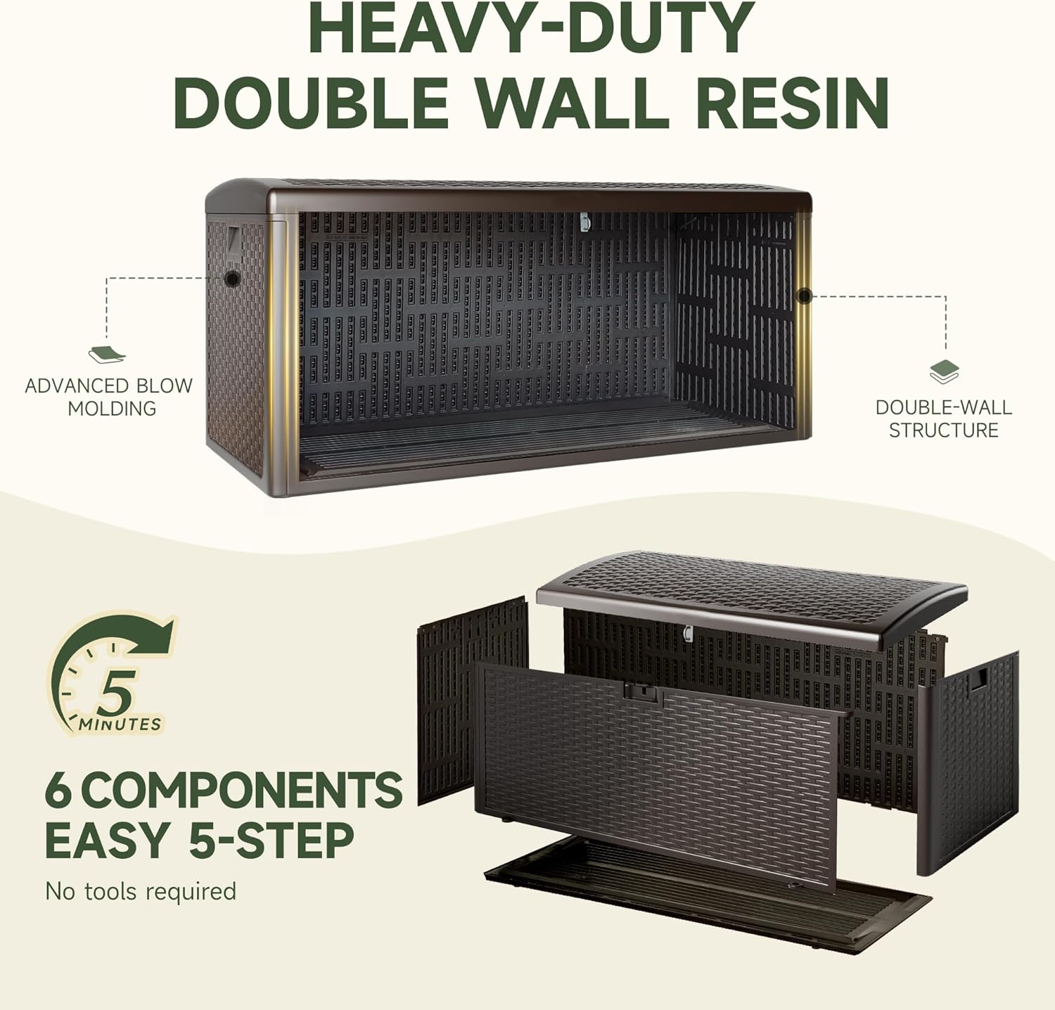 150 Gallon Deck Box, Double Layer Waterproof Resin Outdoor Indoor Storage Box, Lockable & UV Resistant Storage Bin for Patio Furniture, Garden Tools, Pool Accessories (Brown)