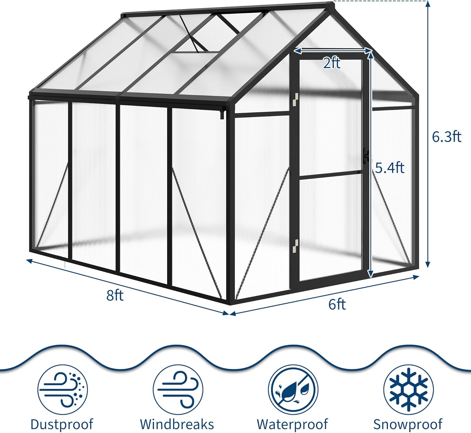 - 【Resilient Construction】Designed to endure challenging weather, our greenhouse features 720g/m² polycarbonate panels and a solid aluminum steel frame. This design ensures stability and protection during heavy rain and gale. Keep your plants safe and thriving in a reliable greenhouse built to last.