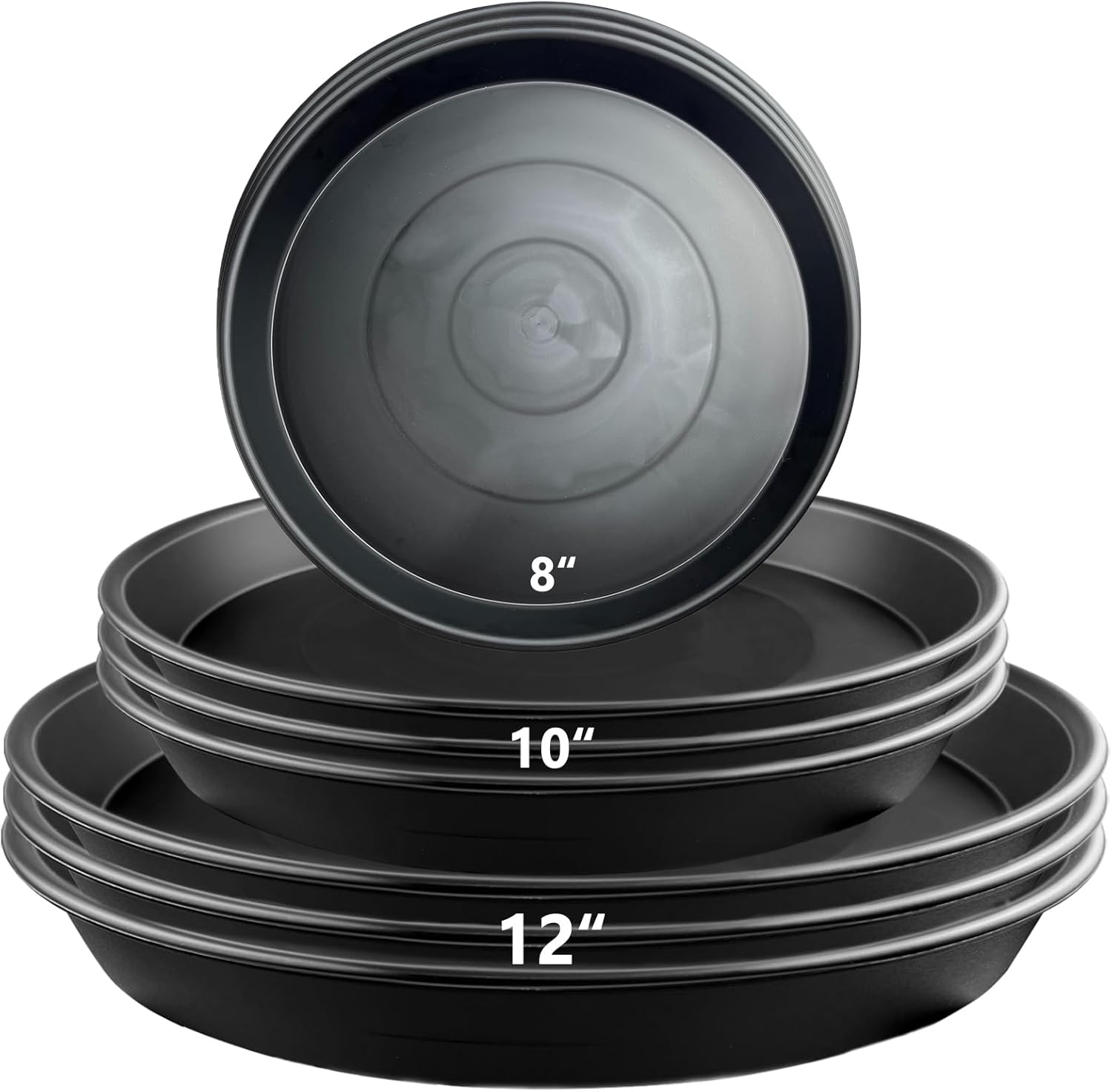 - 【9 Pack Multi-Size Plant Saucers】 Includes 9 pcs durable plant saucers: 3 × 8 inch (8.27" outer dia, 6.81" inner dia, 1.1" height, 70g each), 3 × 10 inch (10.43" outer dia, 8.94" inner dia, 1.18" height, 133g each), and 3 × 12 inch (11.61" outer dia, 10.04" inner dia, 1.26" height, 163g each). Suitable for small, medium, and large flower pots. Manual measurement may cause slight differences, but will not affect normal use.