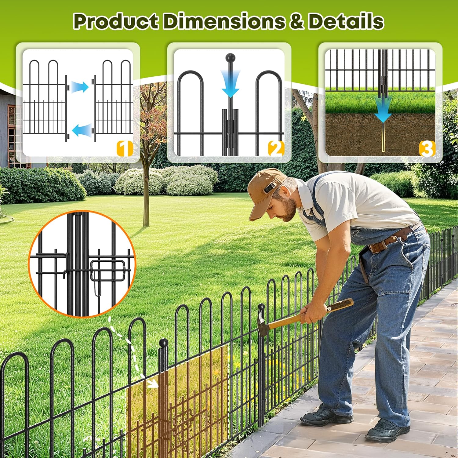 - 【Sturdy Decorative Fence】 The metal ground stakes can be inserted up to 14.72 inches into the ground. The metal fencing panels with a black protective coating is built to withstand outdoor weather and can be used for a long time. The classic U-shaped fencing offers both functional protection and an elegant decorative touch to enhance the aesthetics of the courtyard