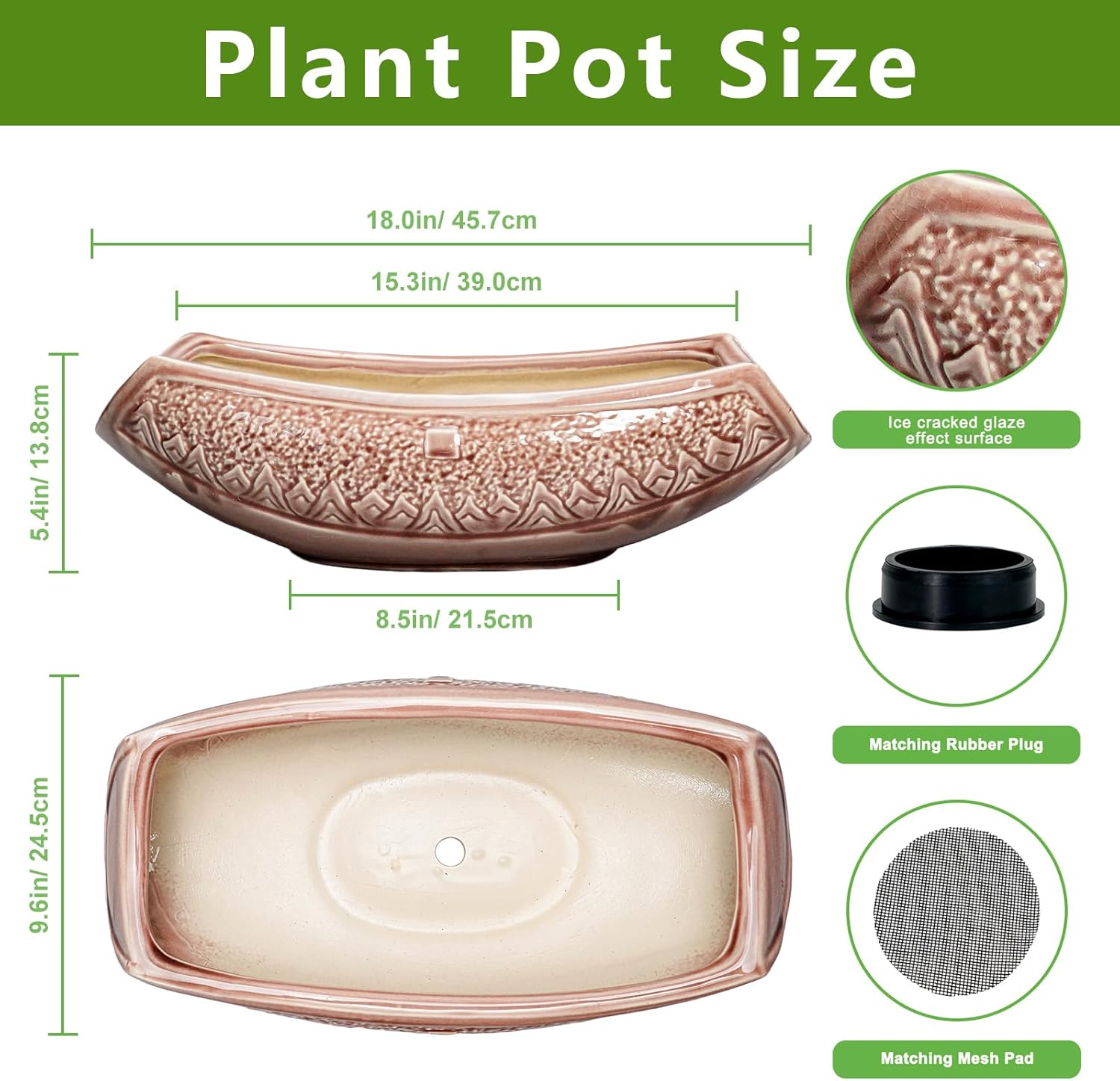 - Sufficiently Large Size: Our ceramic plant pot is 18.0''/45.7cm X 9.6''/24.5cm X 5.4''/13.8cm. Packaging Includes: a ceramic planter, drainage plug, and mesh pad. Thoughtfully packaged to ensure your bonsai tree pot arrives in complete condition