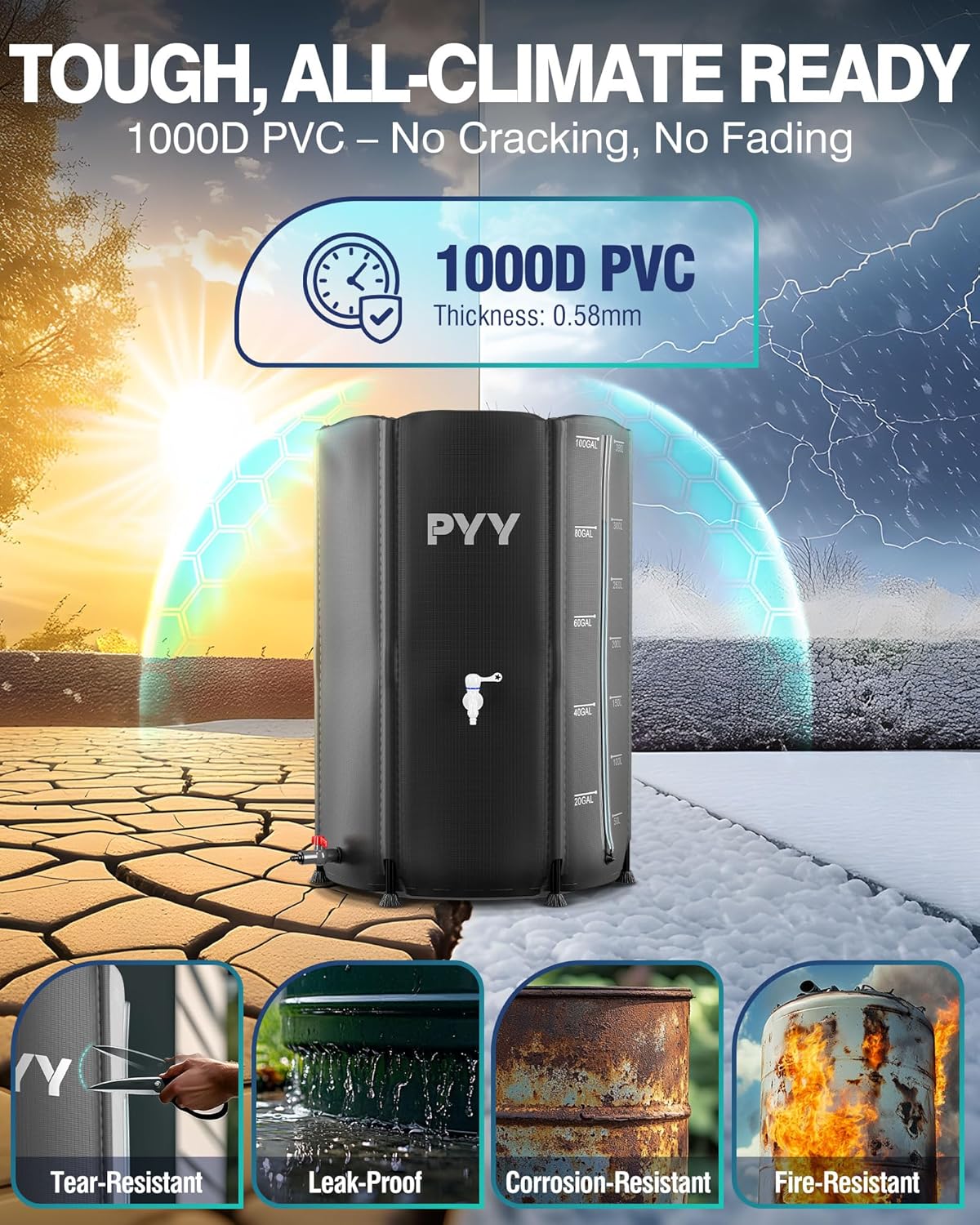 - ๐๐ฎ๐ซ๐๐๐ฅ๐ & ๐๐ญ๐ฎ๐ซ๐๐ฒ: Our rainwater collection barrel is made from high quality 0.5mm thick 1000D PVC, lead-proof, corrosion-resistant, sun-resistant, and crack-resistant. Equipped with 6 robust legs of 1.5mm thickness, the rain storage barrel holds 100 gal water steadily. Enjoy the convenience of irrigation or cleaning in various areas, while our rain water catcher withstands the test of time.