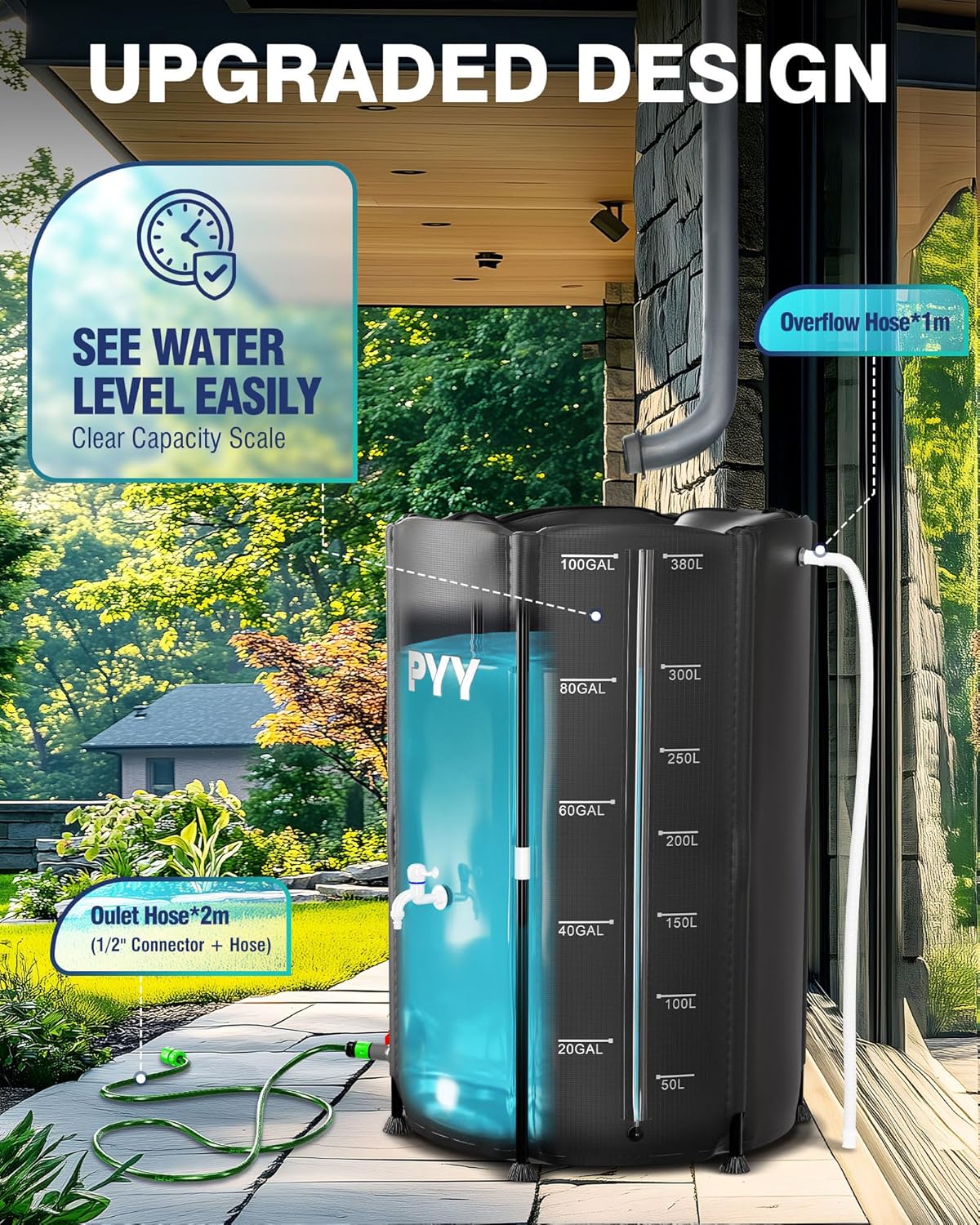 PYY Rain Barrel - 100 Gallon Water Storage Tank with Spigots, Portable Rain Catcher to Collect Rainwater from Gutter, Large Plastic Rain Catchment System with Collapsible Bucket, Black