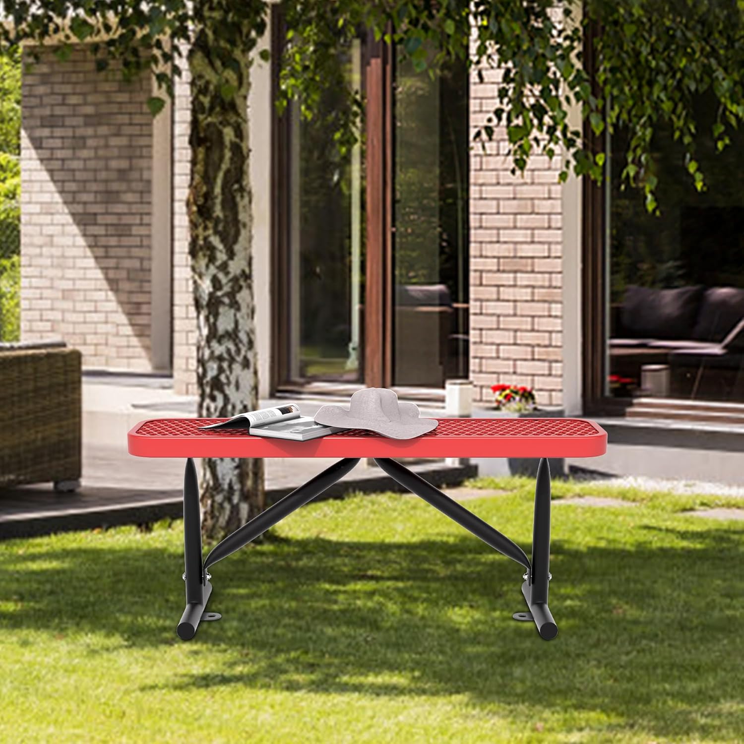 4 Feet Heavy Duty Metal Park Bench for Outside, Outdoor Bench with Portable Frame, Commercial Benches for Shopping Mall, Store, Park, Patio, Deck, Red