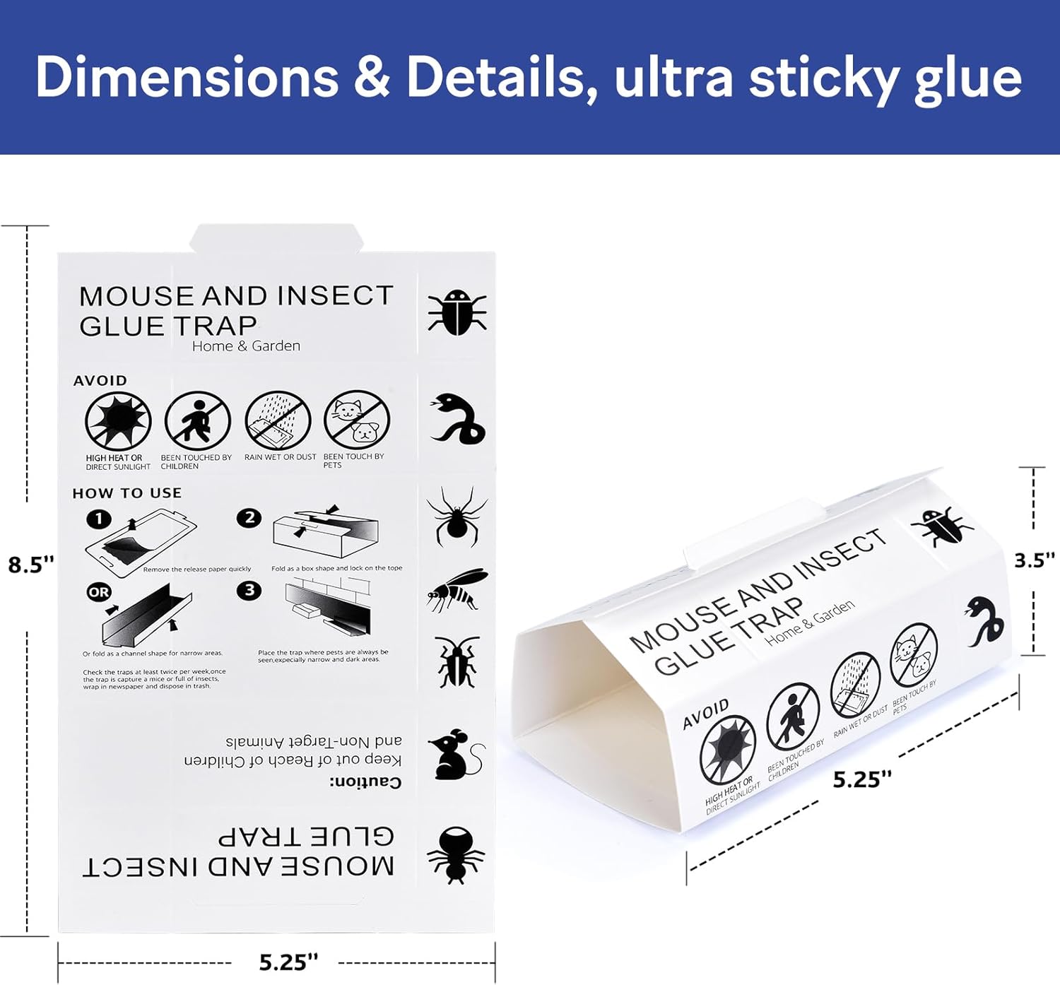 - Versatile Placement: The compact adhesive trays fit in tight spaces like under appliances, along walls, behind furniture, and in cabinets for discreet yet powerful pest control.Check catch mouse & insect glue trap boards daily or when you hear a rattle.