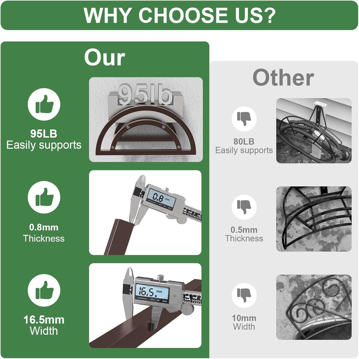 - [HEAVY DUTY HOSE HOLDER]: This garden hose holder wall mounted can hold up to 125 feet of hose. Gives strong reliability with up to 95 lbs of bearing weight. Our garden hose holder was made of high-strength and heavy-duty metal, 0.8mm thickness and 16.5mm width, other hose holder is 0.5mm thick and 10mm wide. So our hose rack is stronger that keep from bending and provide great load-bearing capacity