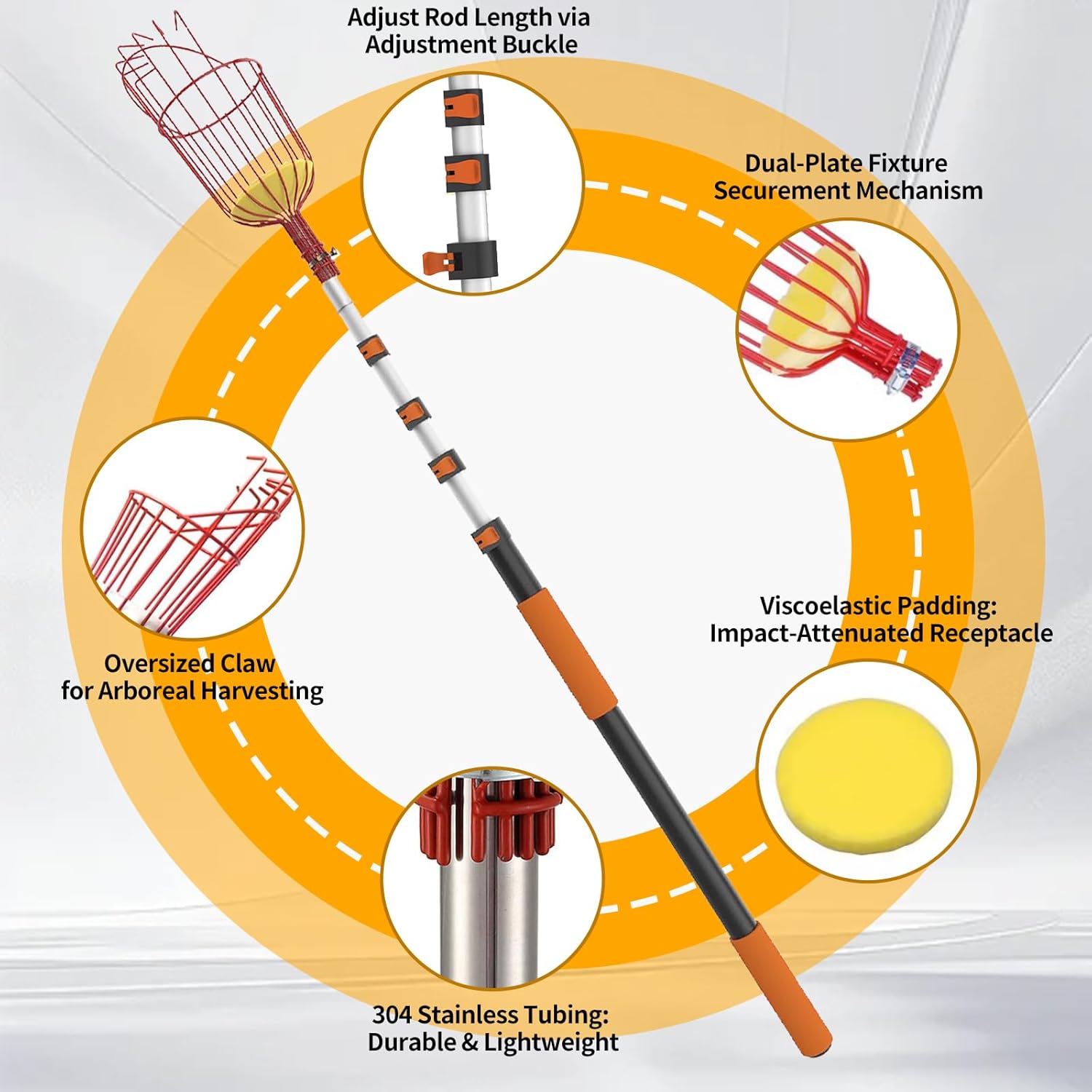 26FT Reach Fruit Picker Pole, Telescopic Picking Pole with Gentle Grip Claw & Collapsible Basket, Adjustable Apple Picker Pole Tool for Avocado Orange Lemon Pear Mango