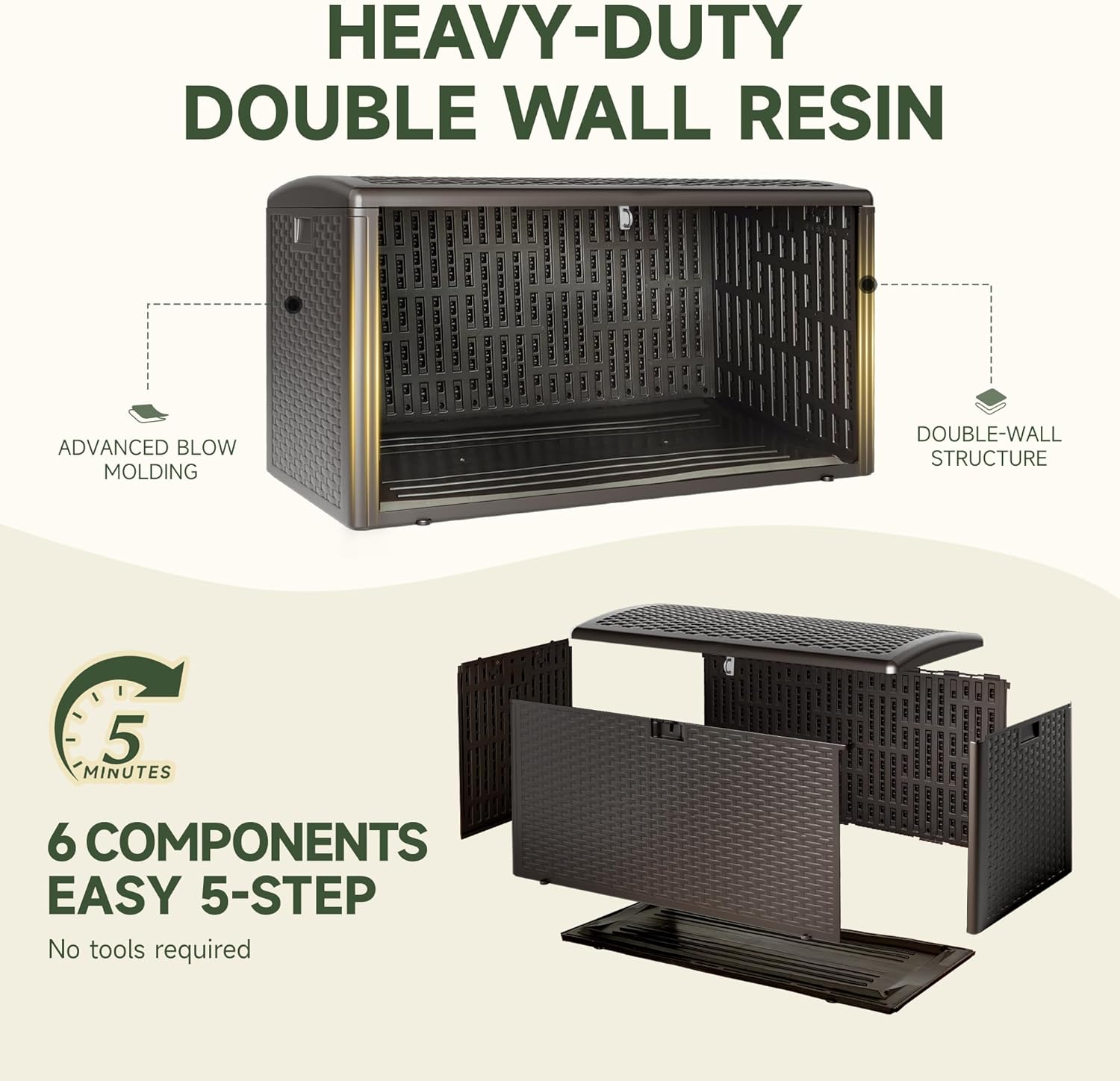 73 Gallon Deck Box, Double Layer Waterproof Resin Outdoor Indoor Storage Box, Lockable & UV Resistant Storage Bin for Patio Furniture, Garden Tools, Pool Accessories (Brown)