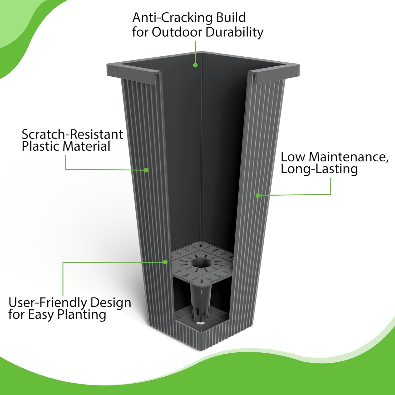 - Built to Endure All Weather Conditions: Crafted from premium, weather-resistant plastic, these tall planters for outdoor plants are designed to resist cracking, fading, and damage from the sun, rain, and snow. Perfect for any season, these large planters for outdoor plants ensure long-lasting durability, making them an excellent choice for outdoor and indoor gardening alike.