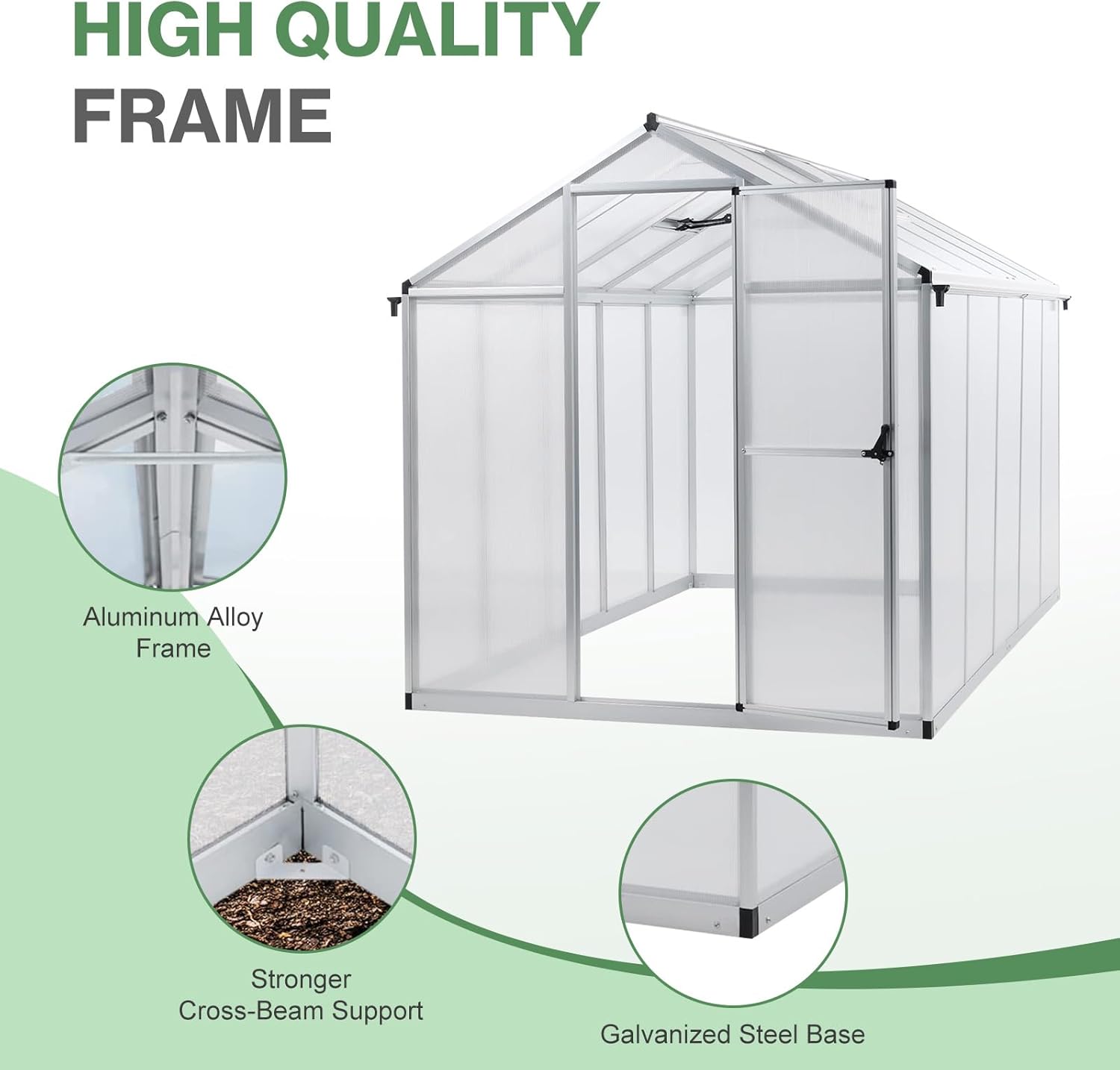 Aoodor 6 x 10 Ft Walk-in Greenhouse with Gutter, Polycarbonate and Heavy-Duty Aluminum Frame, Adjustment Skylight and Lockable 2-Sided Door for Patio, Outdoor, Yard, Lawn Use, Silver