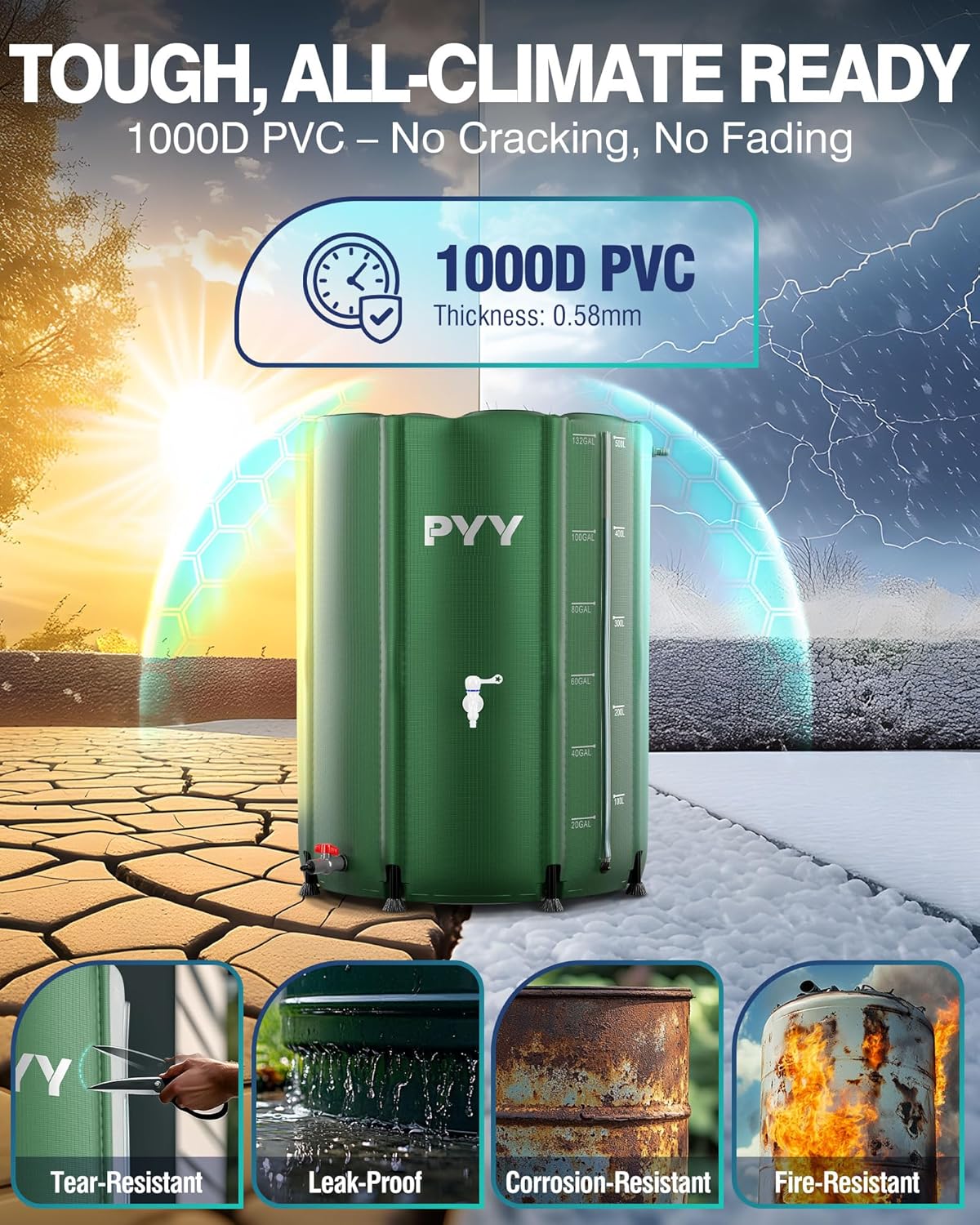 - ๐๐ฎ๐ซ๐๐๐ฅ๐ & ๐๐ญ๐ฎ๐ซ๐๐ฒ: Our rainwater collection barrel is made from high quality 0.5mm thick 1000D PVC, lead-proof, corrosion-resistant, sun-resistant, and crack-resistant. Equipped with 6 robust legs of 1.5mm thickness, the rain storage barrel holds 100 gal water steadily. Enjoy the convenience of irrigation or cleaning in various areas, while our rain water catcher withstands the test of time.