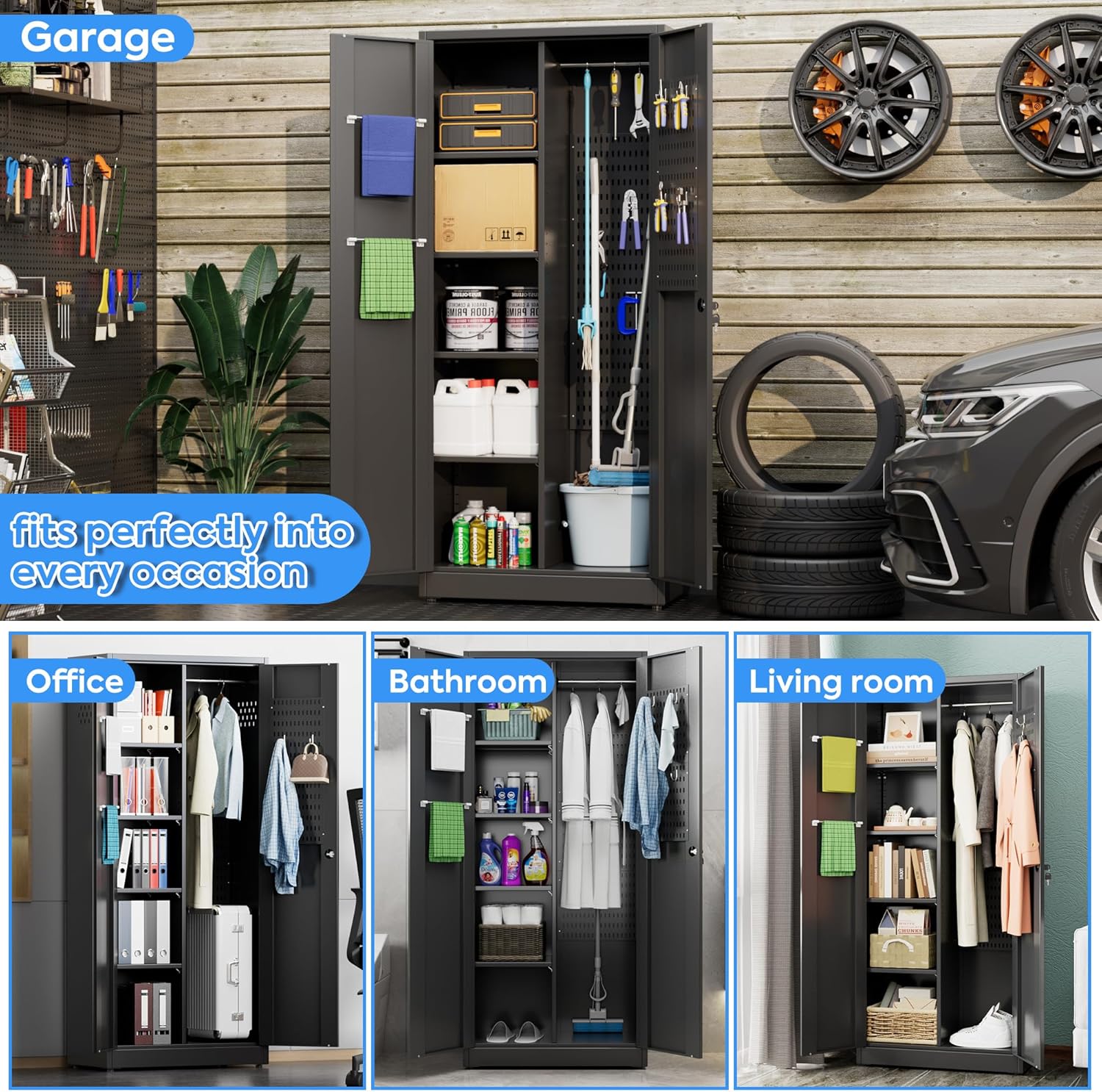 - [DIY YOUR STORAGE] Our storage cabinet provides 4 adjustable shelves, 3 pieces of Pegboard, 1 hanging rod, 2 towel rails, 6 hooks and 3 pegs, catering to your DIY needs. You can design a storage solution that perfectly fits your unique lifestyle and storage requirements.