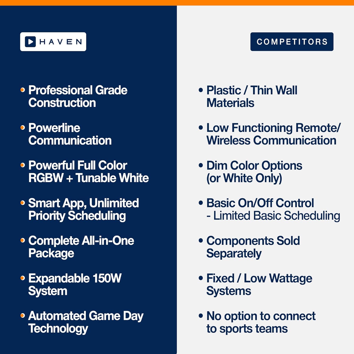 - Game Day & Holiday Ready - Only Haven offers real-time Game Day Technology, syncing your lights to touchdowns or wins. Year-round Scenes automatically update for holidays, even floating dates, making it the most customizable outdoor lighting system available.