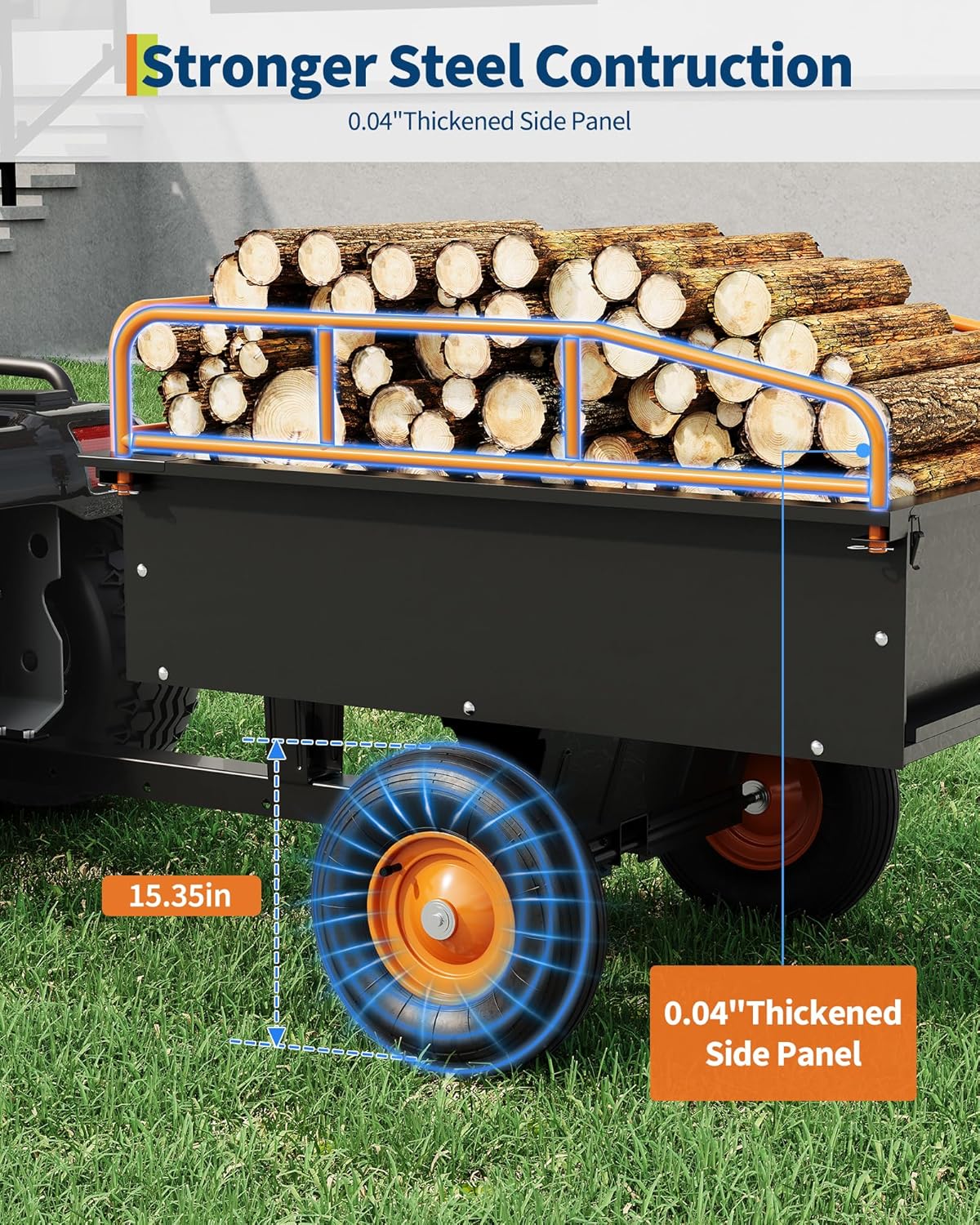 Heavy Duty ATV Trailer Steel Dump Cart, 750 LBS 15 Cubic Feet, Garden Utility with Removable Sides for Riding Lawn Mower Tractor