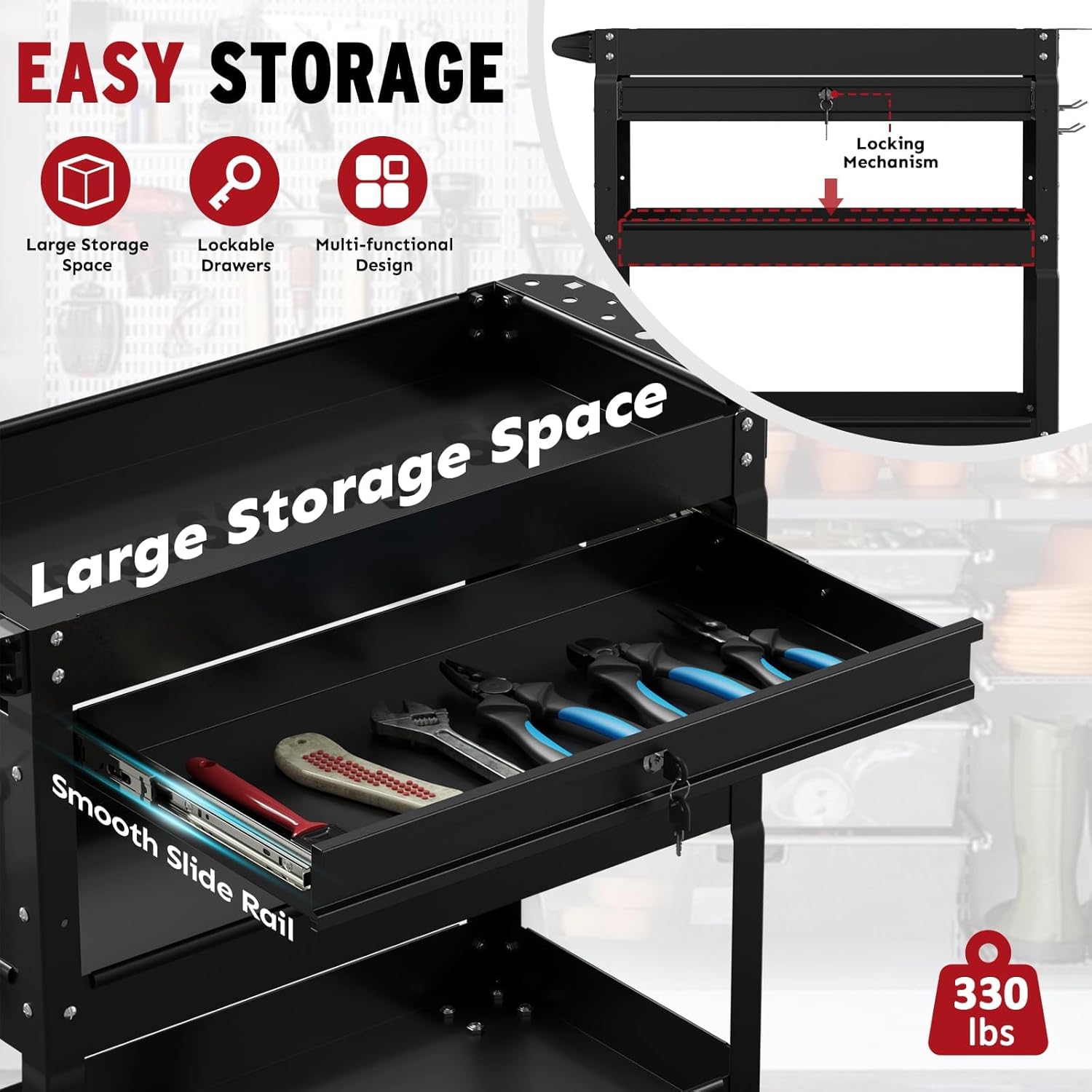 - Efficient Tool Organization: This rolling tool cart offers ample storage space with 3 trays,a lockable drawer, a tool panel. It’s hooks and plugs for small parts, allowing easy access to frequently used tools and enhancing your workflow efficiency.