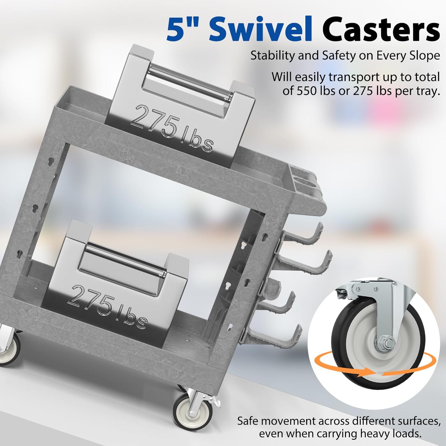 Heavy Duty Rolling Utility Cart with Wheels 2 Tier Utility Plastic Service Work Cart for Shop, Garage, Warehouse, Maintenance 550 lbs