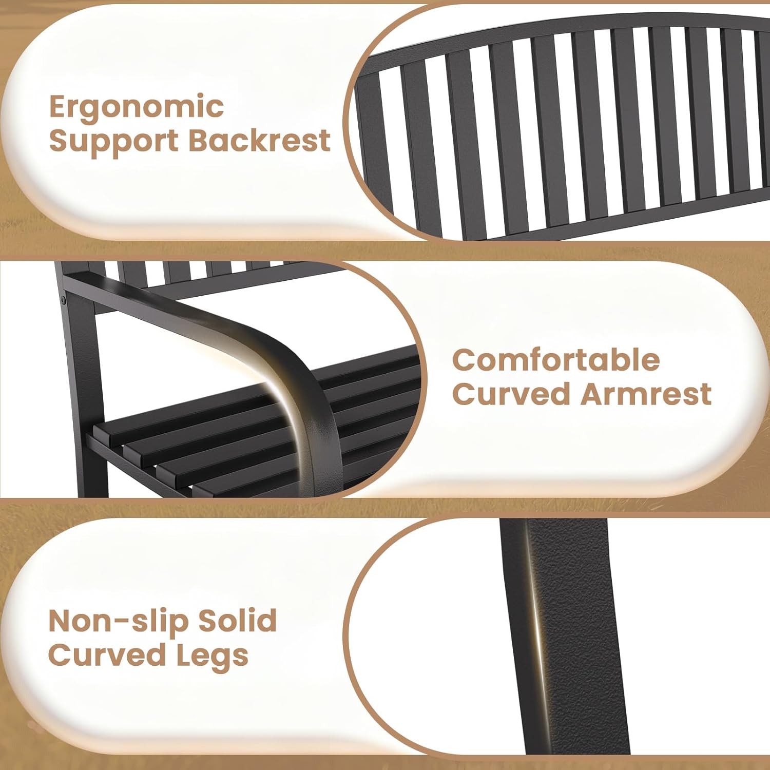 - 【Excellent Metal bench】Unlike fragile wood, this outdoor bench is made of reinforced iron which has excellent sturdiness and stability allow it to support 550lbs and use for years.The garden benches for outdoors applying to lots of areas, such as garden, park, patio, front porch, entryway.