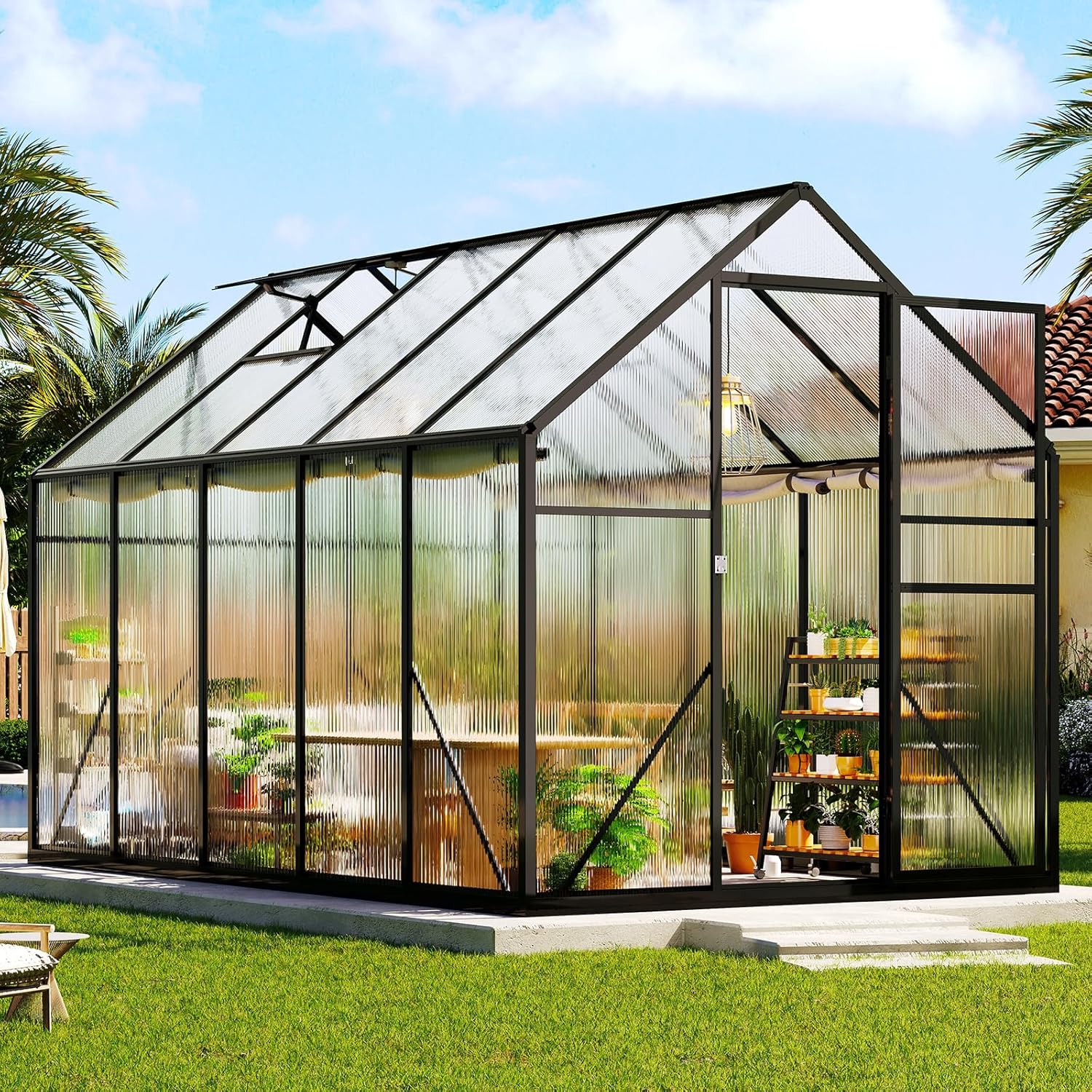 Amerlife 6x10x6.3 FT Ft Polycarbonate Greenhouse for Outdoors, Walk-in Design with Aluminum Frame, 2 Windows and Swing Door, Heavy-Duty Greenhouse Construction for Garden, Black