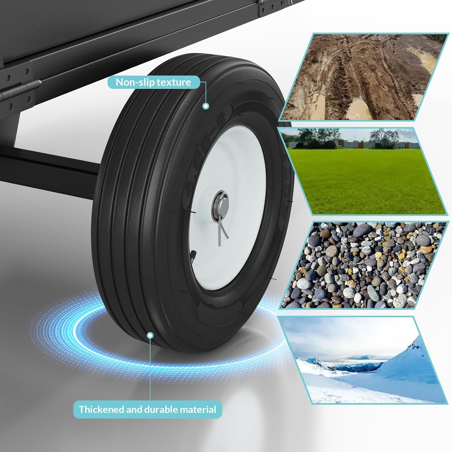 - Large 17 Cu Ft Dump Cart Bed – The spacious cargo bed with removable sides makes this garden dump cart ideal for transporting soil, leaves, tools, and debris. Reduce trips and maximize efficiency during yard work or farming.