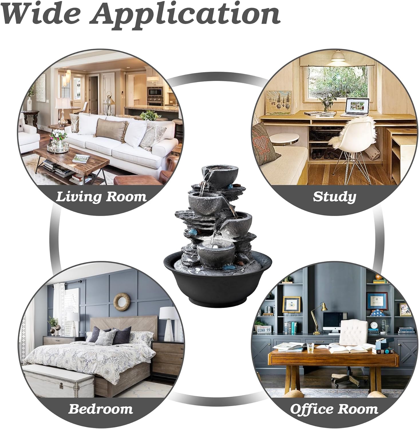 - Wide Application:Suitable for various scenarios, this fountain can be placed in the living room to enhance the home ambiance, in the study to create a peaceful atmosphere for reading and working, in the bedroom for a relaxing environment, or in the office to add a touch of nature and reduce stress.
