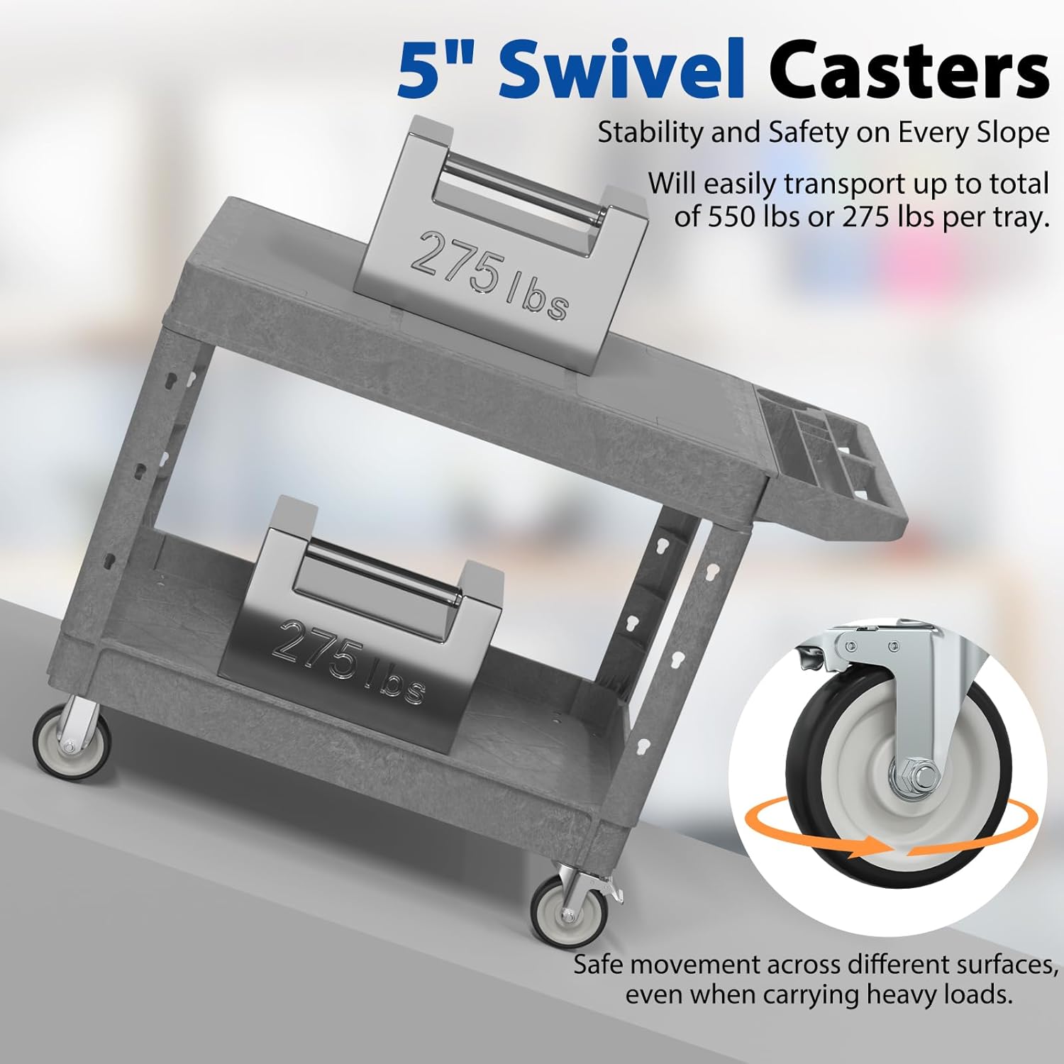 Heavy Duty Flat Top Utility Cart with Wheels 2-Tier Utility Plastic Service Work Cart for Shop, Garage, Warehouse, Maintenance 550 lbs